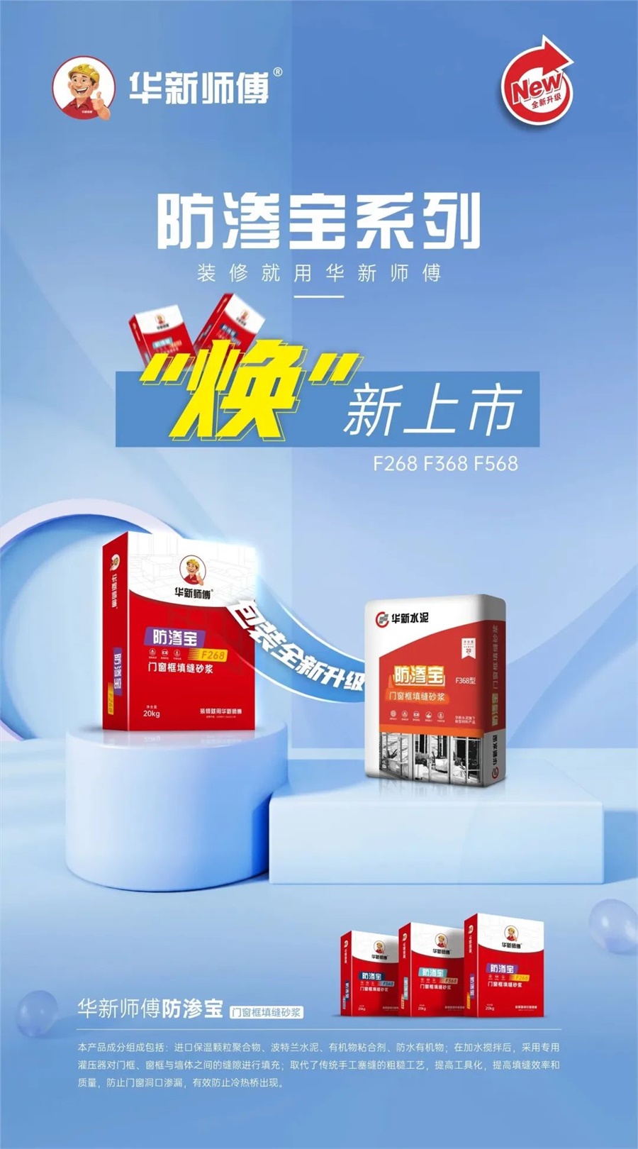 华新师傅®防渗宝系列成分包括:进口保温颗粒聚合物、波特兰水泥、有机物粘合剂、防水有机物。在加水搅拌后,采用专用灌压器对门框、窗框与墙体之间的缝隙进行填充。取代了传统手工塞缝的粗糙工艺,提高工具化,提高填缝效率和质量,防止门窗洞口渗漏,有效防止冷热桥出现。