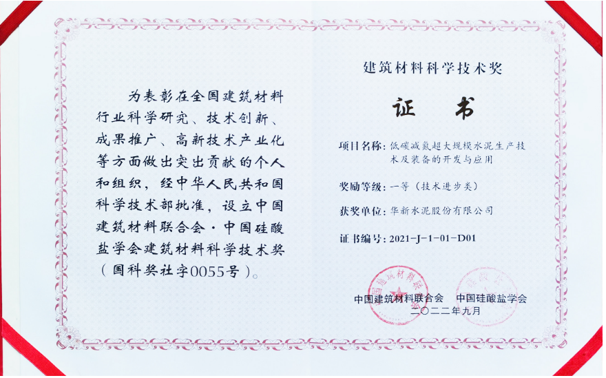 2022年全国建筑材料行业大会对2021年年度建材行业科技奖进行了表彰。华新作为第一完成单位、李叶青作为第一完成人的“低碳减氮超大规模水泥生产技术及装备的开发与应用”项目获得2021年度建筑材料科学技术奖技术进步类一等奖。该项目创造出多个重要技术创新成果,首次实现了万吨级主机设备完全国产化,并研制出了全球最大规模的熟料冷却机、单台水泥联合粉磨系统等主机设备。公司“低热硅酸盐水泥生产工艺技术和应用”项目荣获技术进步类二等奖。会上,公司两个应用项目入选第二批全国建材行业重大科技攻关“揭榜挂帅”项目。会议还对公司入选工业和信息化部2020年度团体标准应用示范项目单位进行了表彰。
